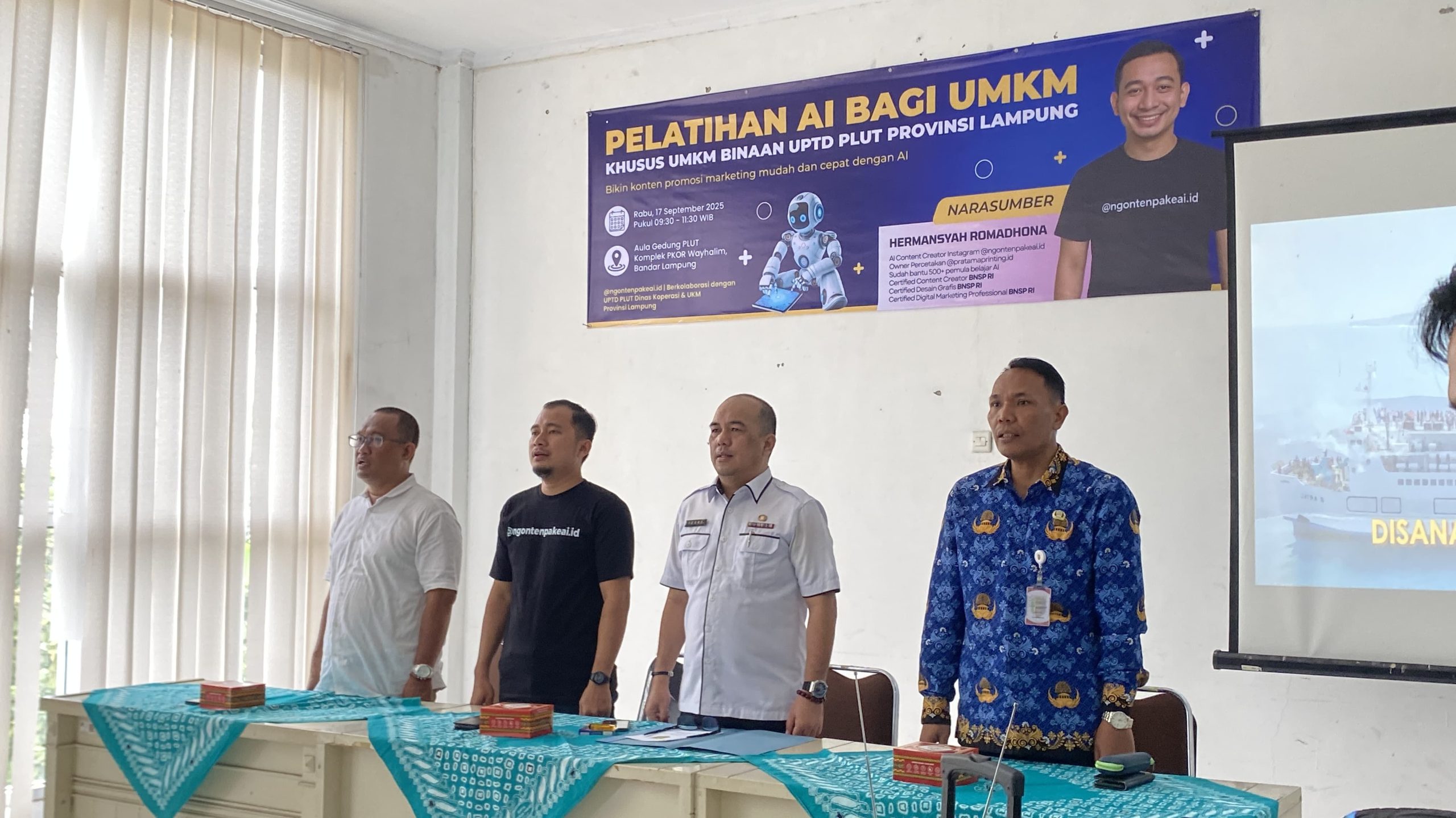 Bandar Lampung Intisarinews.co.id – PTD Pusat Layanan Usaha Terpadu (PLUT) Provinsi Lampung menyelenggarakan Pelatihan Artificial Intelligence (AI) bagi UMKM Binaan, bekerja sama dengan @ngontenpakeai.id. Kegiatan berlangsung di Ruang Pelatihan UPTD PLUT Provinsi Lampung (17/09/25).