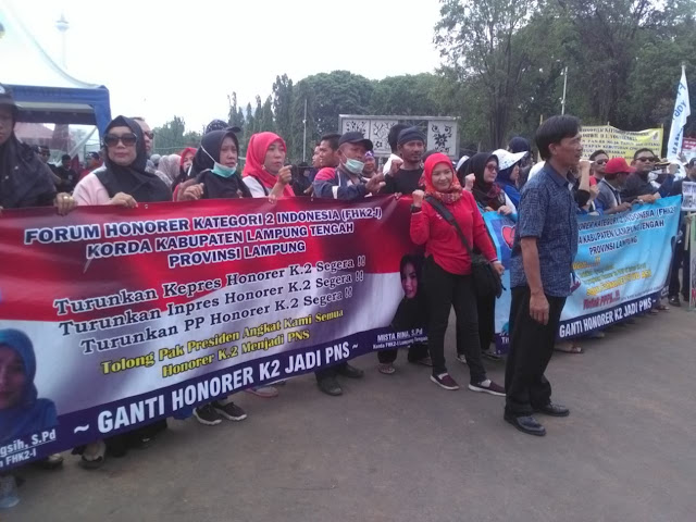 Aksi damai massa penyuaraan aspirasi untuk diangkat sebagai Pegawai Negeri Sipil (PNS) sudah 2 hari 1 malam belum juga menemui kesimpulan karena Presiden Joko Widodo (Jokowi) yang akan mereka temui belum ada tanda-tanda mau menemui massa yang masih terus bertahan.