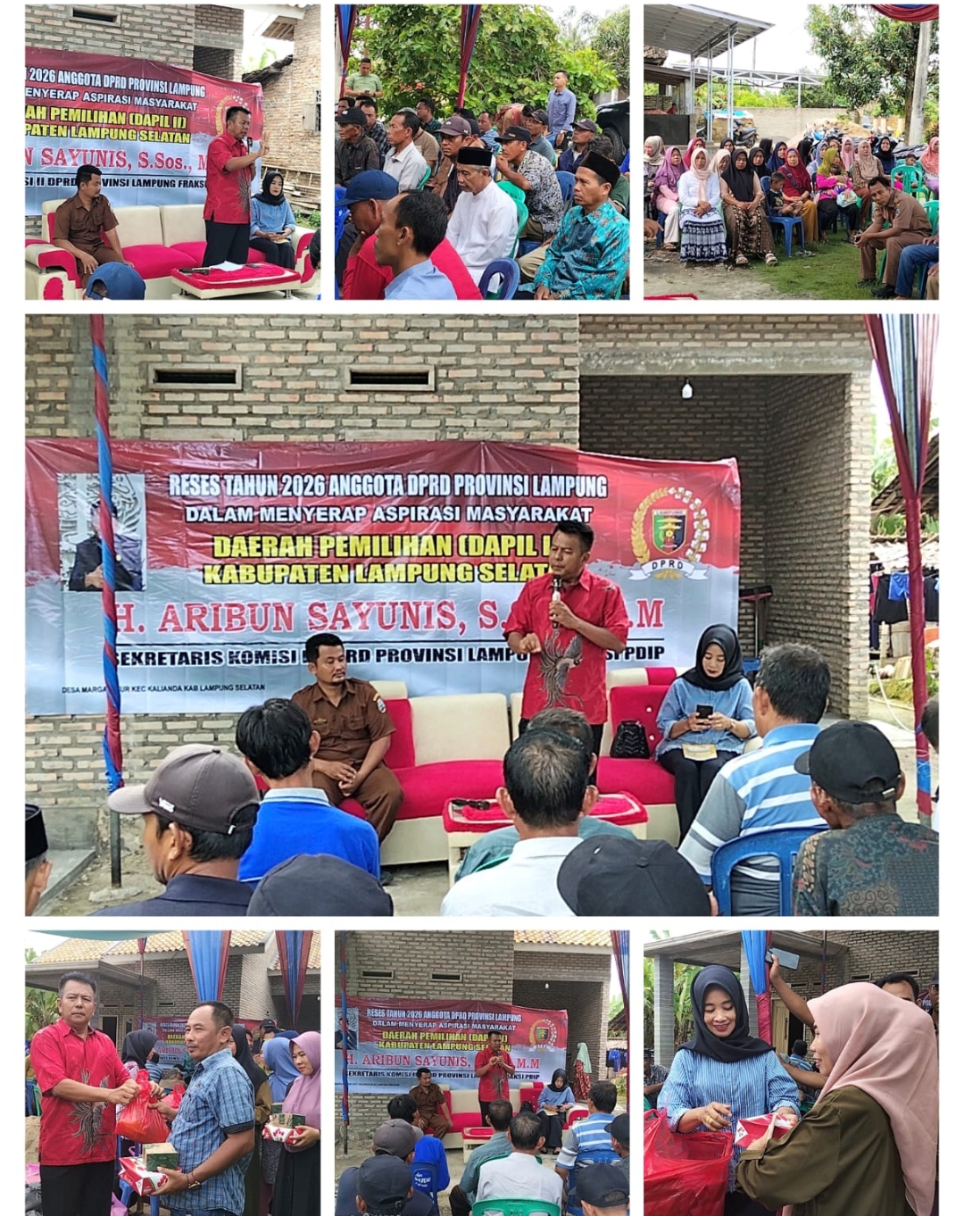 Dalam Paparan H. Aribun Sayunis selaku anggota DPRD Fraksi PDIP Provinsi Lampung menyampaikan bahwa kehadiran dirinya di dapil 2 Lampung Selatan terdapat agenda Reses sudah berjalan 5 titik dan yang lagi pokus Hari ini di kecamatan Kalianda di kecamatan Kalianda salah satunya desa Marga Catur dan Desa Suka Tani Yang di Helad kantor desa.