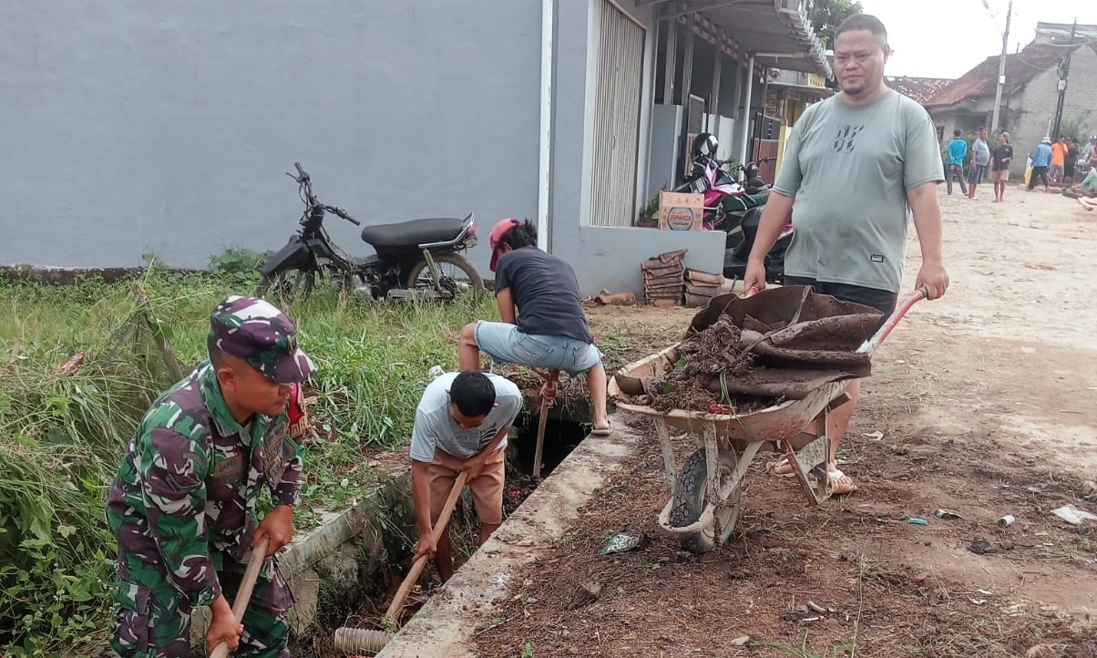 Dengan masih menggunakan seragam dinas, Serda Hendriansyah tak ragu untuk memegang cangkul, bahu-membahu bersama warga membersihkan selokan, agar kotoran sampah dan tanah serta rerumputan liar tidak mengganggu aliran air di komplek perumahan tersebut. Aroma keringat dan tawa renyah warga bercampur, menciptakan suasana kebersamaan yang tulus.